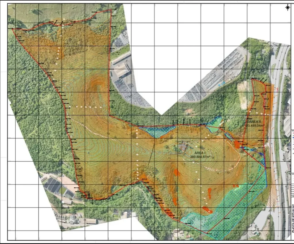 Mapeamento completo com curvas de nível e cotas.